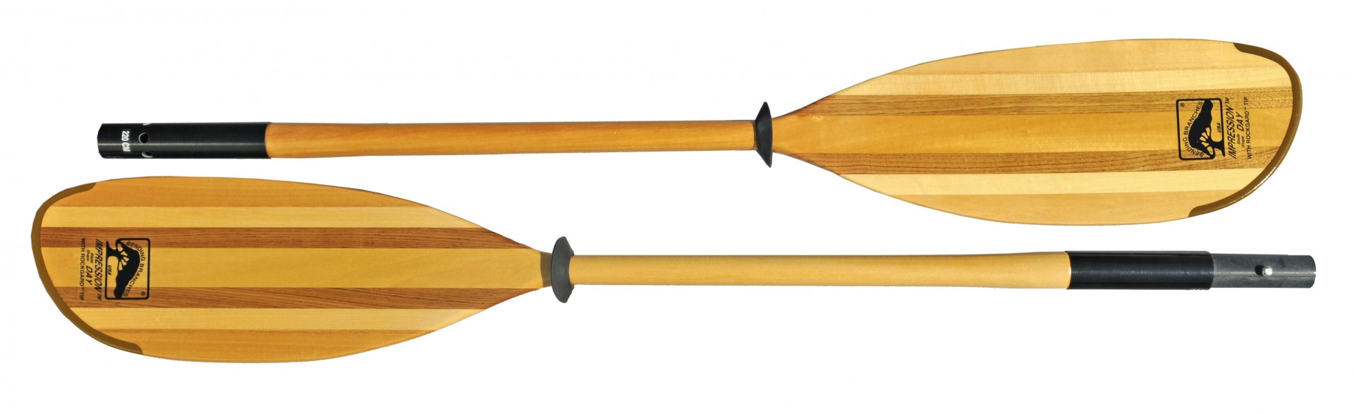 En tilleul d’Amérique (75%) aulne rouge et noyer cendré pour les pales. Extrémité renforcée par un insert en epoxy. La pagaie se démonte en deux parties. 1135 g.